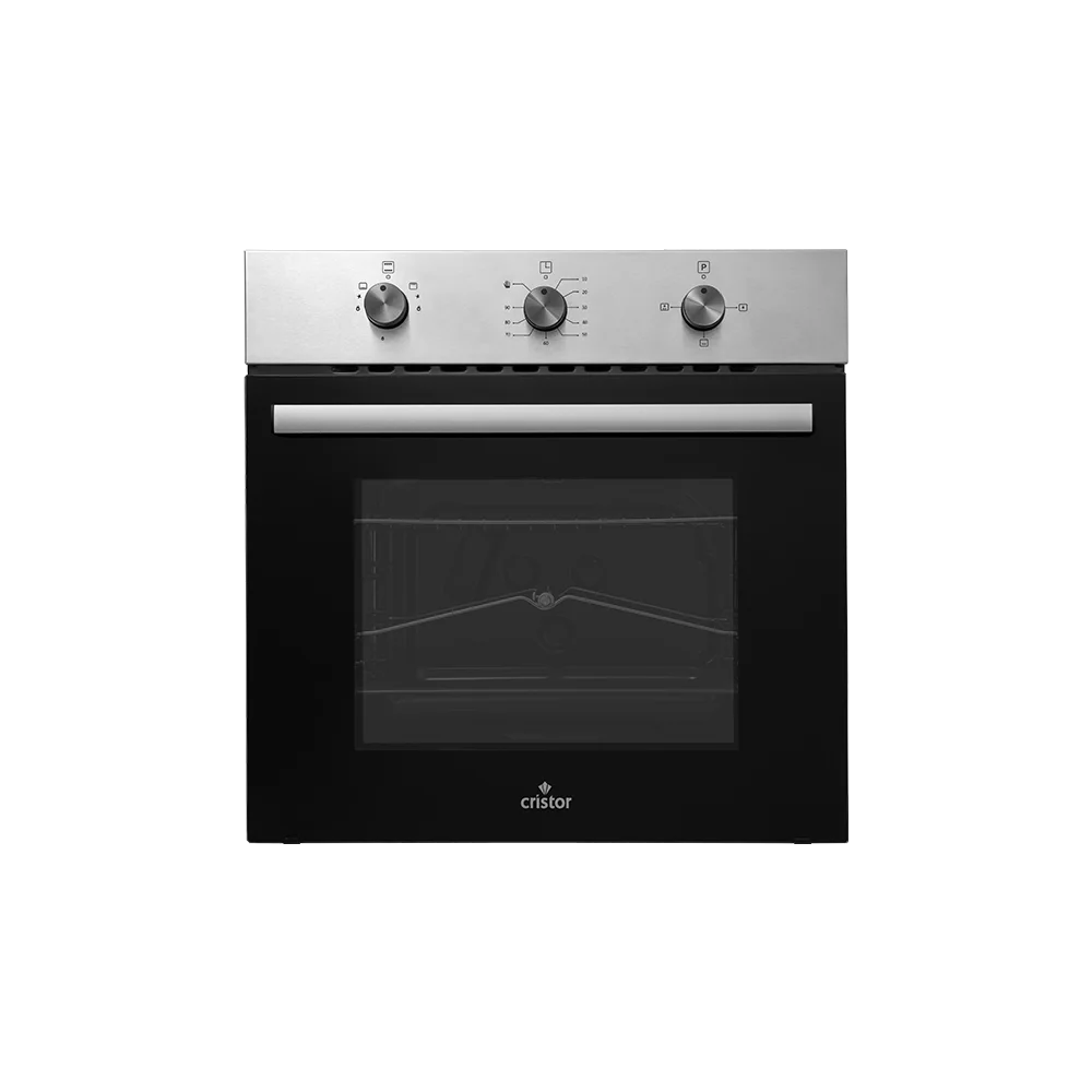 فرن غاز مدمج 60 سم من CRISTOR بسعة 49 لتر، تحكم ميكانيكي، 5 وظائف طهي، شواية مع سيخ شواء، إشعال أوتوماتيكي وأمان بالترموكوبل.